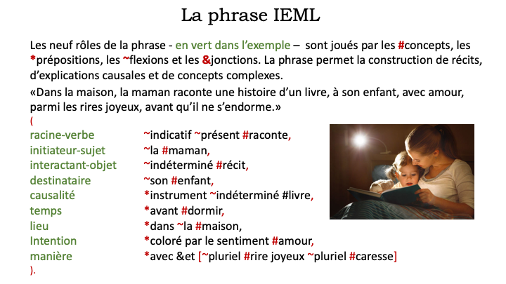 IEML dispose d’une grammaire entièrement régulière et récursive ainsi que d’un dictionnaire de trois mille mots organisés en paradigmes (systèmes de substitution) permettant la construction (récursive et grammaticale) de n’importe quel concept. En somme, tout concept peut être construit à partir d’un petit nombre de briques lexicales selon des règles de composition universelles simples.