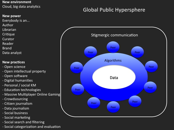L’évolution culturelle a déjà franchi plusieurs seuils d’intelligence collective. En effet, les inventions de l’écriture, de l’imprimerie et des médias électroniques (enregistrement musical, téléphone, radio, télévision) ont déjà augmenté de manière irréversible nos capacités de mémoire et de communication sociale. Le surgissement d’une communication globale par l’intermédiaire de la mémoire numérique est probablement le plus grand changement social des vingt-cinq dernières années. Cette nouvelle forme de communication par lecture-écriture distribuée dans une mémoire numérique collective représente une mutation anthropologique de grande ampleur. Plongés dans le nouvel environnement numérique, nous interagissons par le moyen de la masse océanique de données qui nous rassemble. Les encyclopédistes de Wikipédia et les programmeurs de GitHub collaborent par l’intermédiaire d’une même base de données. A notre insu, chaque lien que nous créons, chaque étiquette ou hashtag apposée sur une information, chaque acte d’évaluation ou d’approbation, chaque « j’aime », chaque requête, chaque achat, chaque commentaire, chaque partage, toutes ces opérations modifient subtilement la mémoire commune, c’est-à-dire le magma inextricable des rapports entre les données. Notre comportement en ligne émet un flux continuel de messages et d’indices qui transforment la structure de la mémoire et contribuent à orienter l’attention et l’activité de nos contemporains. Nous déposons dans l’environnement virtuel des phéromones électroniques qui déterminent en boucle l’action des autres internautes et qui entraînent par-dessus le marché les neurones formels des intelligences artificielles (IA).