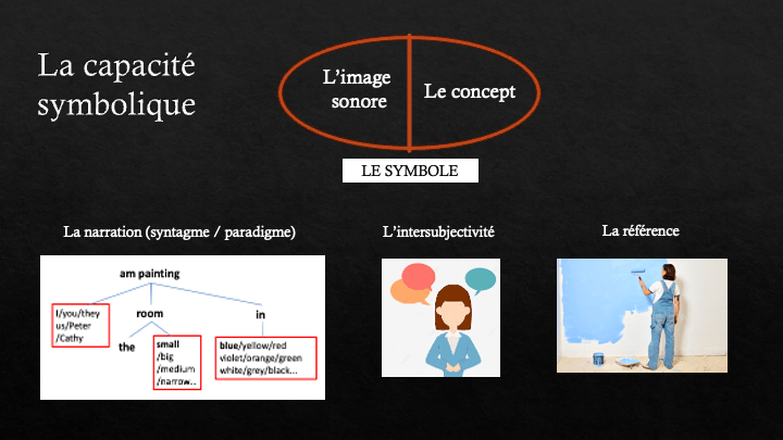 Que signifie comprendre une phrase? Prenons l’exemple simple qui suit : “Je peins la petite pièce en bleu”. Je fais d’abord correspondre au son de chaque mot son concept. Puis, à partir de la séquence parlée, je construis l’arbre syntaxique de la phrase avec, à la racine, le verbe “peins”, à la feuille-sujet le mot “je”, à la feuille-objet l’expression “la petite pièce” et à la feuille-complément de manière le mot “bleu”. Mais ce n’est pas tout. Pour vraiment comprendre “je”, il me faut savoir que la première personne a été choisie par opposition à la seconde et à la troisième personne. Pour saisir “bleu” je dois savoir que c’est une couleur et qu’elle représente une sélection parmi le paradigme des couleurs (jaune, rouge, vert, violet, etc.). Et ce n’est que par rapport à grand, long ou étroit que “petite” fait sens. Bref, dans une expression symbolique simple telle qu’une courte phrase, chaque mot occupe une place dans un arbre syntaxique et actualise un choix dans un groupe de substitutions possibles.