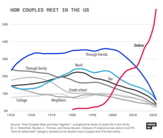 R1 – L’hyper-connectivité ne concerne pas seulement les jeunes, elle est partout. Un des facteurs principaux de l’évolution culturelle réside dans le dispositif matériel de production et de reproduction des symboles, mais aussi dans les systèmes logiciels d’écriture et de codage de l’information. Notre intelligence collective prolonge celle des espèces sociales qui nous ont précédées, et particulièrement celle des grands singes. Mais l’usage du langage – et d’autres systèmes symboliques – tout comme la force de nos moyens techniques nous a fait passer du statut d’animal social à celui d’animal politique. Proprement humaine, la Polis émerge de la symbiose entre des écosystèmes d’idées et les populations de primates parlants qui les entretiennent, s’en nourrissent et s’y réfléchissent. L’évolution des idées et celles des peuplements de Sapiens se déterminent mutuellement. Or le facteur principal de l’évolution des idées réside dans le dispositif matériel de reproduction des symboles. Au cours de l’histoire, les symboles (avec les idées qu’ils portaient) ont été successivement pérennisés par l’écriture, allégés par l’alphabet et le papier, multipliés par l’imprimerie et les médias électriques. Les symboles sont aujourd’hui numérisés et calculés, c’est-à-dire qu’une foule de robots logiciels – les algorithmes – les enregistrent, les comptent, les traduisent et en extraient des patterns. Les objets symboliques (textes, images fixes ou animées, voix, musiques, programmes, etc.) sont non seulement enregistrés, reproduits et transmis automatiquement, ils sont aussi générés et transformés de manière industrielle. En somme, l’évolution culturelle nous a menés au point où les écosystèmes d’idées se manifestent sous la forme de données animées par des algorithmes dans un espace virtuel ubiquitaire. Et c’est dans cet espace que se nouent, se maintiennent et se dénouent désormais les liens sociaux. Avant de critiquer ou de déplorer, il faut d’abord reconnaître les faits. Les amitiés des jeunes gens ne peuvent plus se passer des médias sociaux ; les couples se rencontrent sur internet, par exemple sur des applications comme Tinder (voir la Figure 1) ; les familles restent connectées par Facebook ou d’autres applications comme WhatsApp ; les espaces de travail ont basculé dans l’électronique avec Zoom et Teams, particulièrement depuis la pandémie de COVID ; la diplomatie se fait de plus en plus sur X (ex Twitter), etc. On ne reviendra pas en arrière. D’un autre côté, on ne se déplace pas moins de manière physique : en témoignent les embouteillages monstrueux de Sao Paulo et Rio de Janeiro. Dans le même ordre d’idées, la tendance sur les dix dernières années – époque de croissance exponentielle des connexions Internet – montre aussi une augmentation du nombre de passagers aériens, qui continue une tendance séculaire, et cela malgré une baisse importante durant la pandémie de COVID-19.